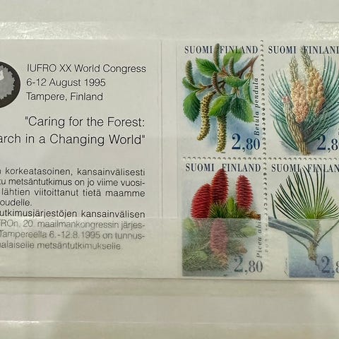 * Metsä ja metsäntutkimus -vihko, koivu, mänty, kuusi, tutkimustyö ~ 4 merkkiä, arvo 4 x 2,80 mk.