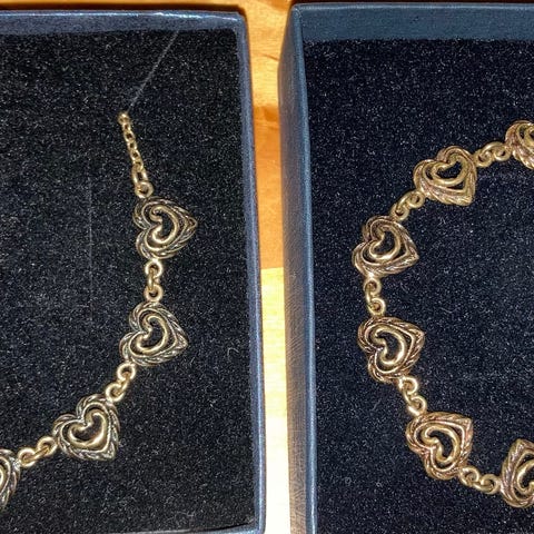 Myydään kalevalan talon sydän sarjan kaulakoru ja rannekoru. Hintapyyntö 45e yhteensä molemmista. Kunto hyvä. Materiaali: pronssi