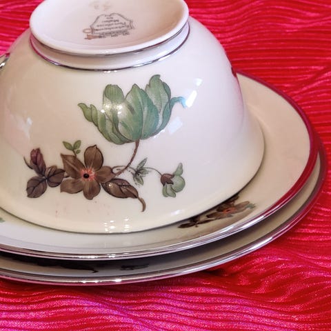 8 kpl kahvikuppia lautasilla sekä pieni kaadin. Kopoltin siniset. 24 karatin kultauksilla.