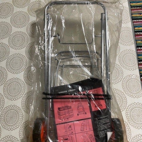 Risteilymatkoille aivan ehdoton kuljetuskärry. Kunto hyvä +, ehjä, pyörät suorassa, varsin tukeva menee kivasti kasaan matkan alkaessa. Käytetty vain kahdesti. Korkeus on 90 cm. Nouto Kerava Ahjo , voin postittaa ja toridiilikin käy.