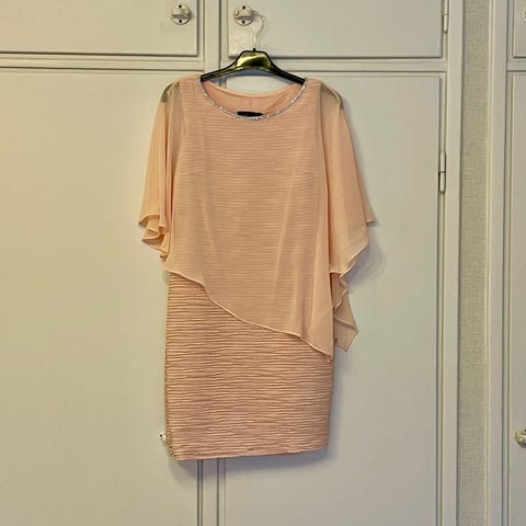 Myydään kerran häissä käytetty juhlamekko. Frank Lyman 248297 juhlamekko tummansinisenä. Mekossa on kotelomekkomainen, noin polvimittainen, jersey-tyyppinen alaosa, jonka päällä on sifonkimainen poncho-osa. Poncho on kolmiomainen, edestä keskeltä pidempi. Hihat ulottuvat kyynärvarteen; päälliosa on strassilaattoja. Ovh 359 €.