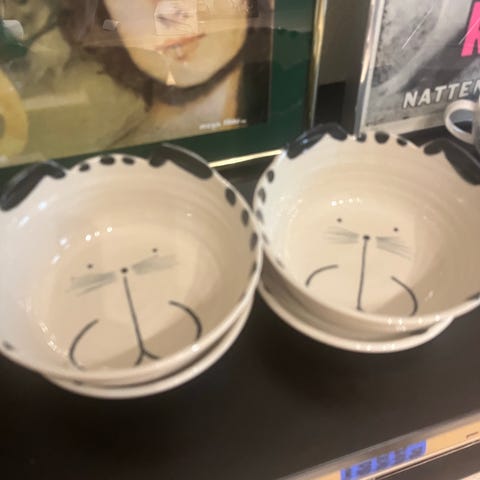 Käsinmaalattujen kissalautasten setti. Yksi iso (halkaisija 30,5 cm) ja kuusi syvää lautasta. Hyvin vähän käytetty! 15€