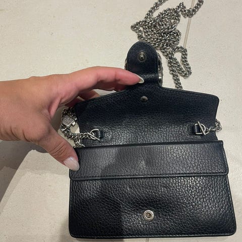 GUCCI GUCCY Stars Medium Dionysus -olkalaukku. Tämä tyylikäs musta laukku on valmistettu vasikannahasta, jossa on kultaiset minitähdet ja teksti "GUCCY" painettuna keskelle käyttämällä "Sega"-videopelikirjaimia kunnianosoituksena 80-luvulle. Laukussa on ikääntyneen näköinen hopeaketjuinen olkahihna, jossa on vanhalta näyttävät hopeiset metallilinkit ja ikoninen Dionysuksen tiikeripää hevosenkenkä. Sisäosa on kahteen osaan jaettu taivaansininen satiini, keskellä vetoketjullinen tasku. Laukun etuosassa on läpän alla tasku. Olkahihnan pudotus 22/36 cm. Laukku on hienokuntoinen eikä siinä ole juuri mitään silmin havaittavia käytön jälkiä. Valmistettu Italiassa.