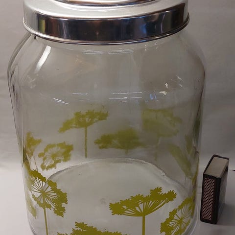 Lasinen aaltoileva purkki jossa puinen kansi. Ollut koristeena.