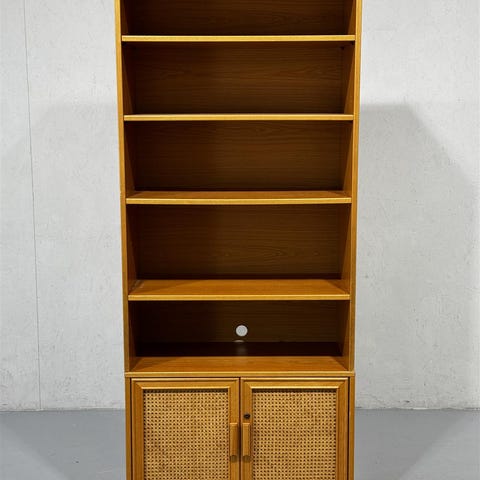 Tuotetiedot: Vanha rottinkihylly, jossa on kaksi hyllytasoa. Hyllyn alaosassa on kaappiosa, jossa on myös yksi hyllytaso.