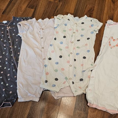H&M harmaa lyhythihainen yöpuku/oloasu. Koko 80cm. Hihansuissa ja lahkeensuissa röyhelöä, nepparikiinnitys.