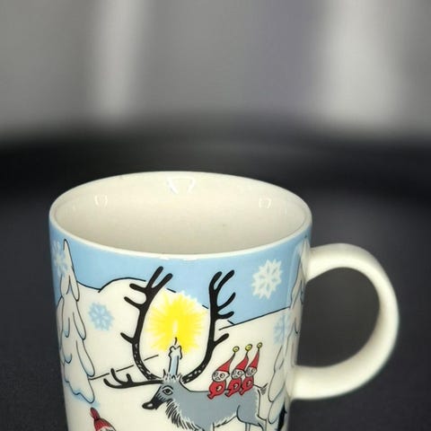Myydään tarrallinen Talvimetsä-muumimuki. Hinta 45 euroa. Myös postitus onnistuu tarvittaessa.