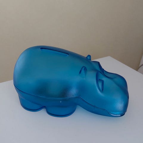Säästöpossu, pituus noin 16 cm. Väri: läpinäkyvä sininen.