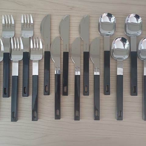 Myydään lähes käyttämättömät italialaiset Inoxpran aterimet. Aterimissa kultaus.