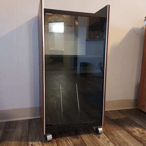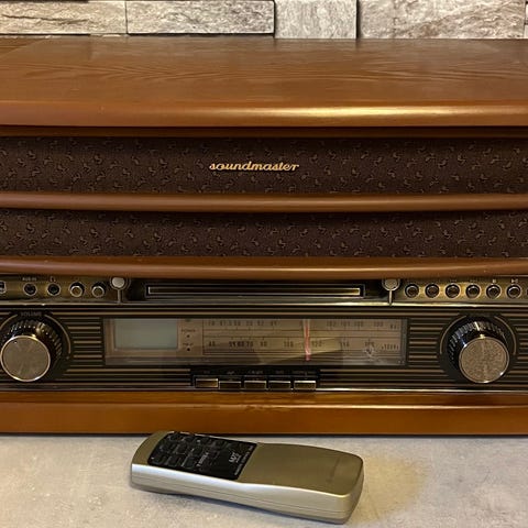 Erittäin hyväkuntoinen stereoräkki lasiovella. Sisäleveys 360 mm.
