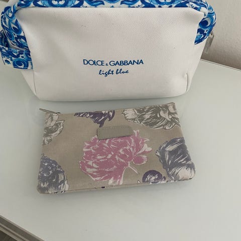 Myydään tummansininen meikkilaukku, jossa on hopeanvärinen vetoketju. Laukun etuosassa on teksti "DOLCE & GABBANA BEAUTY", luksusbrändin kosmetiikkalaukku.