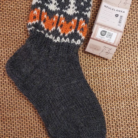 Kuvanmukaiset uudet kettusukat. Koko 30. Kudottu Novita Nalle langasta, 75% villaa, 25% polyamidi.