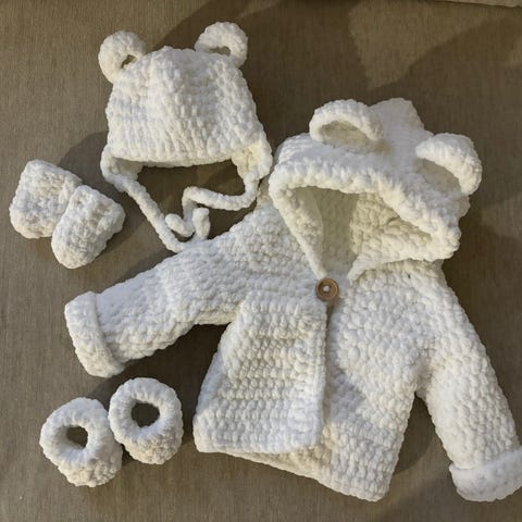 Ohuesta langasta uusi käsinneulottu vauvan mekko ja polvisukat.