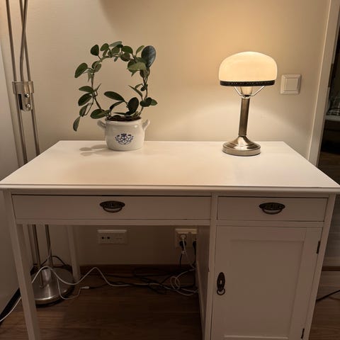 Vanha pieni kirjoituspöytä, jossa kaappi ja 2 kpl vetolaatikoita. Pöydän oikeassa reunassa olevat jalat kaipaavat hieman liimausta.