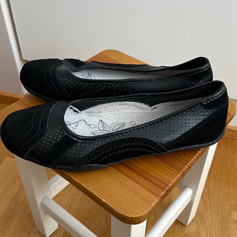 Mustat italialaiset Melania mokkanahkaiset ballerinat pehmeällä Sole tech-pohjalla, tunnetusti mukavat jalassa. Koko 39, ei kovin suuri, mutta vastaa kokoaan ja miellyttävä kärjen muotoilu. Juhlavat, mutta mukavat. Näissä on ollut jalkapöydän yli "remmi", joka poistettu, kuvassa 8 kohta ympyröitynä, ompeleet purettu siis auki. Ei pistä silmään mokan pinnasta. Käytetty jonkin verran, mutta asiallinen kunto, reunanauha osin pätkissä. Näkyy kuvissa samoin kuin luonnossa.