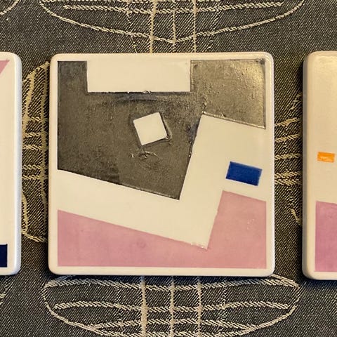 Myydään neljä (4) kappaletta kotimaisen nykytaiteilijan, Esa Blick, teoksia pakettina. Jokainen teos kuuluu taiteilijan "Alkumuodot" -sarjaan. Kolme näkyvät ensimmäisissä kuvissa yhdessä sekä lisäsin vielä neljännen seinältä lisäksi pakettiin, josta erikseen kuvat.