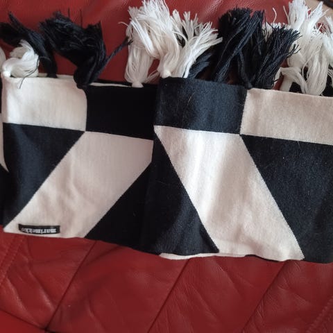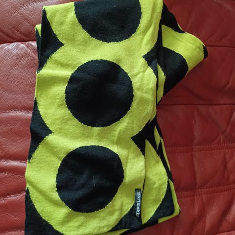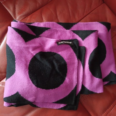 Marimekon kirjava ohut kaksikerroksinen kaulahuivi silkkimäisestä materiaalista. Pituus noin 132cm ja leveys noin 29cm.