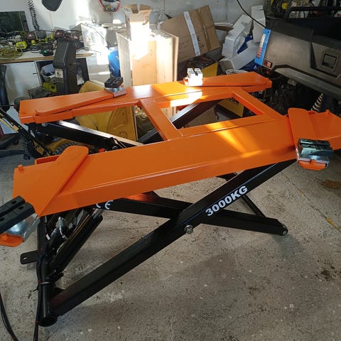 Matalaprofiilinen siirrettävä matalasaksinostin, joka nostaa 1,2 metriä ja 4000 kg.