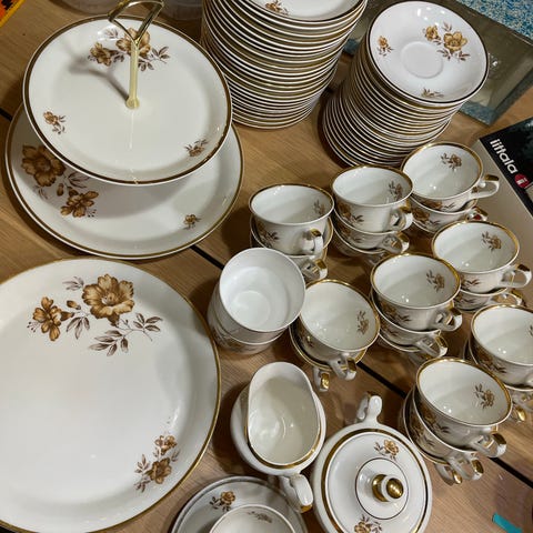 Arabia Myrna -sarjan kahviastiasto suunnittelija Olga Osol. Vähän käytetty, ollut lähinnä lasivitriinissä koristeena. Sisältä 8 kahvikuppia, 8 aluslautasta, 8 pullalautasta, kermakon ja sokerikon kannella. Kruunuleimat. Kultaus ei ole vaurioitunut, käsin pesty. Kaikki ovat uudenveroisessa kunnossa. Nouto Kouvolan Keltakangas tai kulkeutuu lähialueelle omien menojen mukaan.