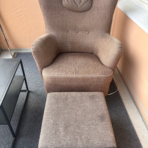 Nojatuoli ja rahi, kummassakin jokin tummentuma kankaassa. Ei yritetty poistaa. Muuten hyvässä kunnossa.
