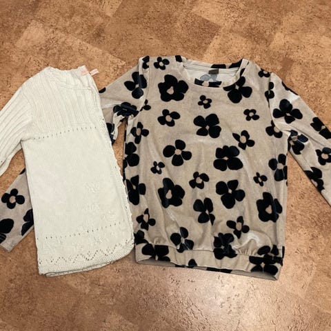 Pinkit housut, merkki H&M. Kangas hieman kimaltelevaa. Valkoinen vähänkäytetty trikoopaita, merkki H&M, puuvillaa. Valkoiset sukkahousut, Finnwear, puuvillaa. Kaikki kokoa 134 cm.
