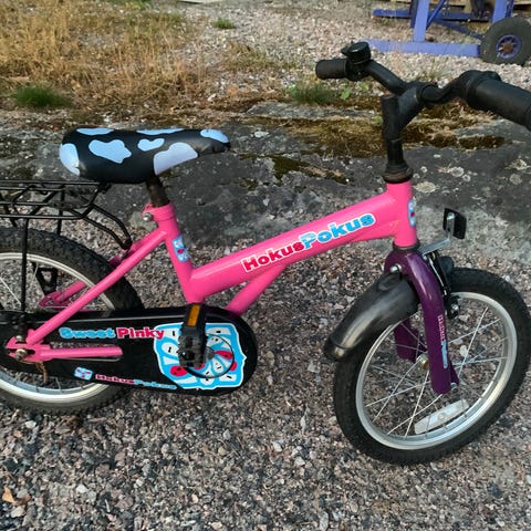 Noin 5-6-vuotiaalle sopiva tukeva pyörä. Vikoina pieni palkeenkieli istuimessa.