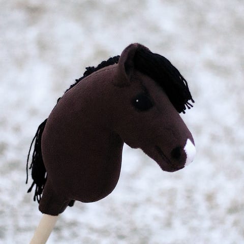 Tyttären tekemä uusi keppihevonen. Mukaan muutama varuste.