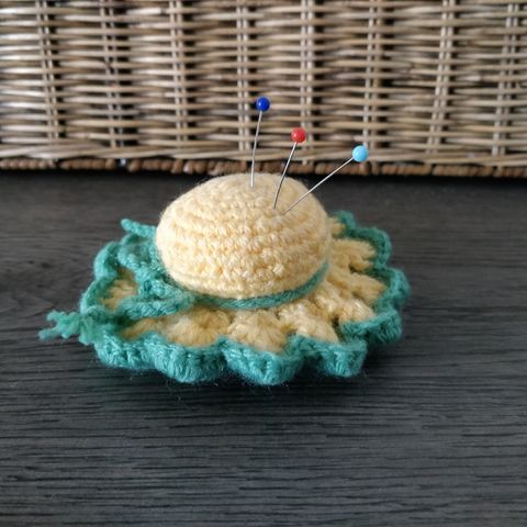 Neulatyyny virkattu hattu, lierin halkaisijia noin 10cm. Nuppineulat eivät tule mukaan.