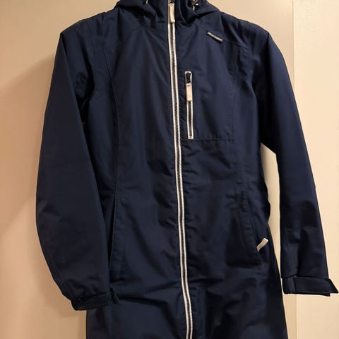 Koko M. Edessä rannoilla 2 valetaskua. Vyötäröllä kaksi "oikeaa" taskua napeilla. Takin kiinnitys myös napeilla. Kauluksessa ja hihansuissa karva.