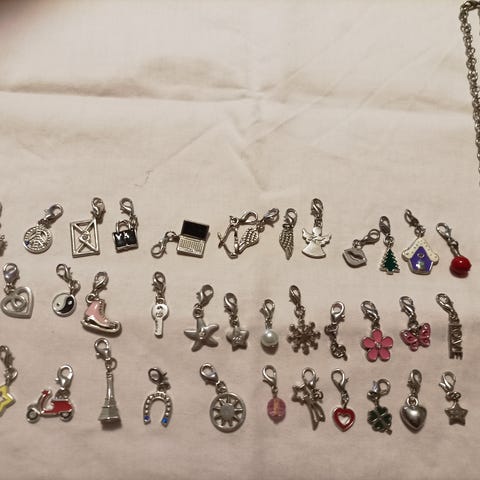 Charm U sarjan koruja mitä voi vaihdella rannekoruun. Mukana teline ja reppuja jossa voi säilyttää myös koruja.