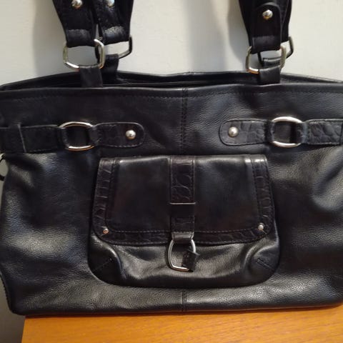Sisällä vetoketjullinen tilanjakaja + pienempi vetoketjutasku sekä kännykkätasku. Pohjaa suojaavat niitit.