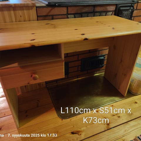 Pöytä tehty aikanaan mittatilauksena kahdesta eri puulajista (mänty ja koivu). Pinnassa musta saunavaha ja alatasossa viilutus. Kestävä ja laadukas pöytä. Viimeisissä kuvissa näkyvät kosmeettiset naarmut ja alatason yksi jalka kaipaa liimausta. Myös näyttötelineelle sahattu tilaa pöydän takapaneelista. Tästä jollekin joko pöytä korjattavaksi ja käyttöön, tai vaikkapa pajalle työpöydäksi. Pöytä ei mene osiin, joten nouto ainoa vaihtoehto. Lisätietoa saa kysymällä.