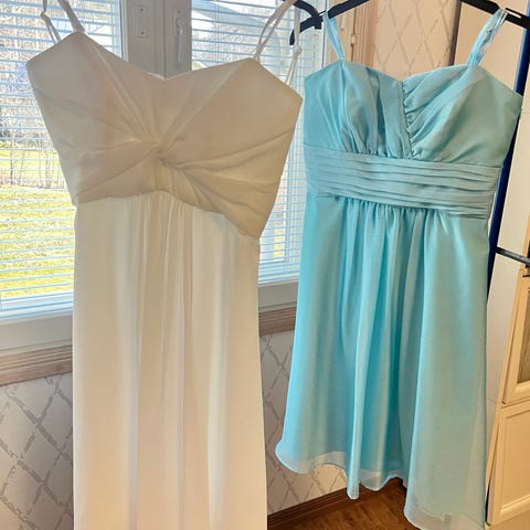 Divided merkkinen kaunis ja joustava mekko, kesämekko. Pohjaväri valkoinen, jossa kauniita sinisiä kuvioita. Koko 34 tai XS. Alaosa levenee ja laskeutuu kauniisti. Ka-ka mitta n 32 cm.