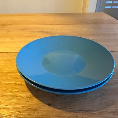 Kolme lautasta ja yksi muki, yksi lautasista kuluneempi kuin muut. Ehjiä kuitenkin kaikki.
