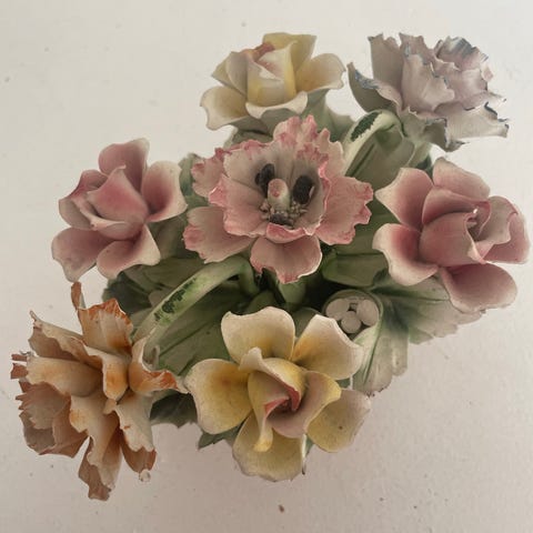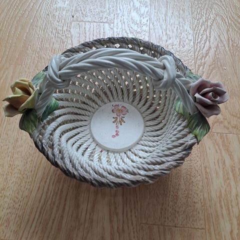 Suloinen miniatyyrinen kukkakori, noin 1970-luvulta. Englantilaisen Jon Antonin käsinmaalattua luuposliinia.