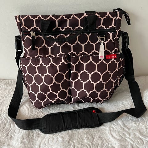 Tyylikäs ja käytännöllinen hoitolaukku (Skiphop greenwich simply chic). Laukku on tekonahkaa ja kuin uusi. (Oli käytössä Korona-aikaan eli hyvin vähällä käytöllä.) Tämän kanssa kelpaa lähteä kaupungille, neuvolaan, mihin vain.