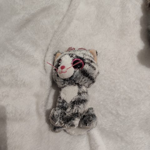 Valkoinen kissa pehmolelu. Kissalla on violetit korvat ja tassut. Vaaleanpunainen rusetti on kaulassa. Ihanan pehmeä valkoinen karva. Hyväkuntoinen. Päässä valkoinen naru mistä voi kantaa lelua tai laittaa roikkumaan. Volker Racehorn GmbH & Co. Mahassa sisällä on jotain kuulia, mutta muuten lelun on todennäköisesti pumpulia täytteenä.