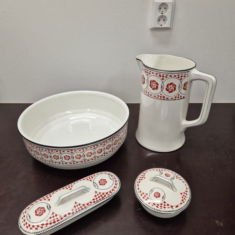 Myyntiin tarpeettomiksi jääneet keramiikka esineet (kulho ja kannu), jotka alun perin hankittu mökkisisustukseen pääsemmättä kuitenkaan koskaan esille.