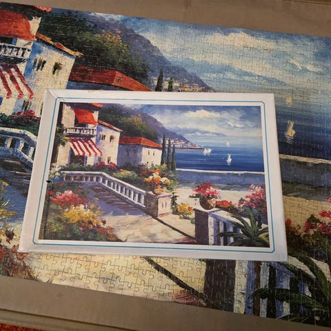 Hyväkuntoinen palapeli, purettuna omassa laatikossaan.