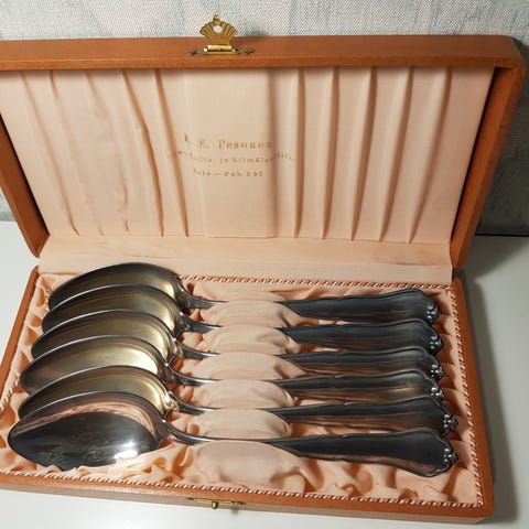 Retro hopeoitu Sorsakoski ruokalusikka, 6 kpl alkuperäisessä lahjapakkauksessa, kun uusi.