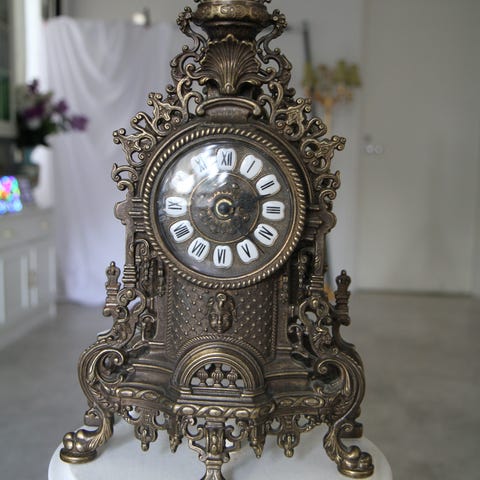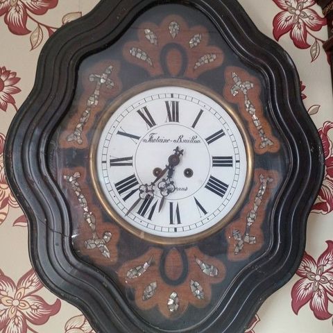 Sveitsiläinen vedettävä heilurikelloPEINT A LA MAIN pöytämalli. Palais Royal kellotaulu. Korkeus on 42 cm ja leveys 21 cm sekä syvyys 10 cm.