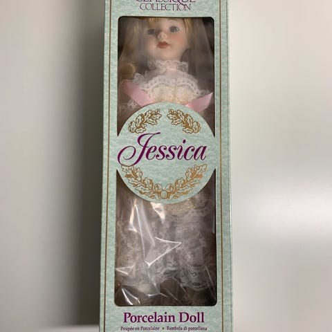 The Classique Collection -sarjan posliininen Rosa-niminen keräilynukke avaamattomassa paketissa. Itse paketti ei ole täydellisessä kunnossa.