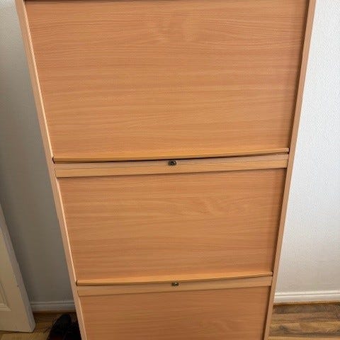 Kaksi toimistokaappia ja mappihyllyä. Yhden leveys 107 cm, korkeus 75 cm ja hyllyn syvyys 35 cm