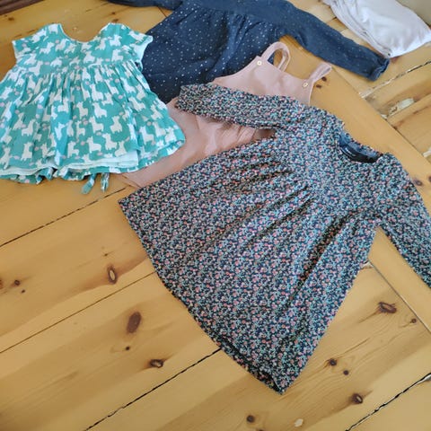 Viisi ohutta mekkoa. Koot vaihtelee 86/92 - 98 cm. Polarn o. Pyret -mekossa tahra helmassa, näkyy kuvassa. H&M pallokuvioisessa mekossa myös hailakka tahra, siitäkin kuva. Nämä tahrat eivät ole tavallisessa pesussa lähteneet, erillistä tahranpoistoa en ole kokeillut.