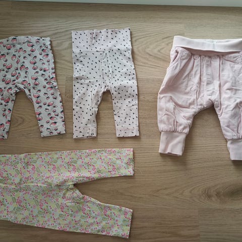 Kerran päällä olleet housut ja paita sekä vyö(?) tai panta. Merkki Monia, kokomerkintä 62 mutta housut vastasivat mielestäni kokoa 56.