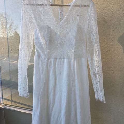 Uutena ostettu Monica Loretti 8224 häämekko. Väri nude. Koko EU 42, olen S-M kokoinen, 161 cm pitkä ja korot oli 5 cm. Mekkoa on minulle lyhennetty, yläosaa kavennettu ja laahus poistettu.