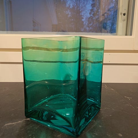 Virheetön, punainen lasimaljakko, jossa valkoinen sisäpuoli. Korkeus 30 cm.