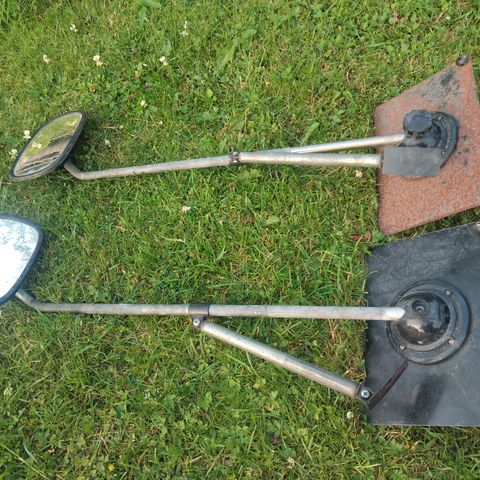Sivupeili jostain vanhasta autosta, peili kulunut. Leveys 11/13cm. Korkeus 8,5cm.