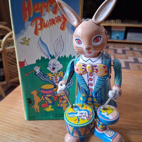 Retro pupu. Tanssii ja heiluttaa kehoaan, laitteesta tulevan musiikin soidessa, samaan aikaan. Toimii sormiparistoilla. Korkeus n.40cm. Kunnossa ei ole mitään moitittavaa.