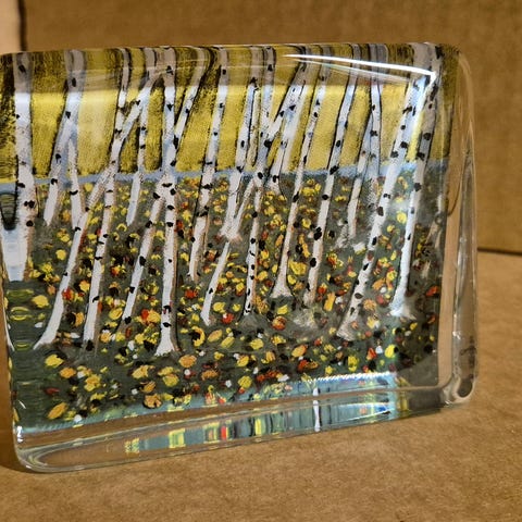 Iittalan Heljä Liukko-Sundströmin lasitaulu, jossa talvinen maisema noin 14 x 11,5cm.